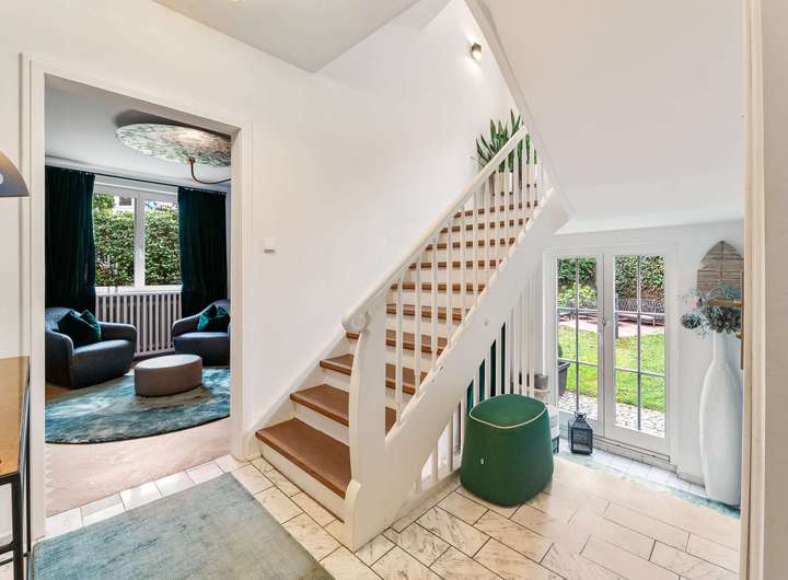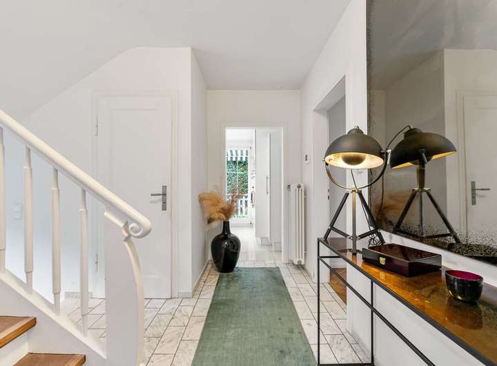 Die Villa beeindruckt durch hohe Decken und ein außergewöhnlich großzügiges Raumgefühl – viel Platz zum Leben, Arbeiten und Entfalten. Das Grundstück ist optimal blick- und lärmgeschützt, vollständig umsäumt von hohen Hecken und einem organisch gewachsenen Baumbestand. Der liebevoll angelegte Außenbereich schafft eine harmonische Verbindung zwischen Wohnen und Natur.