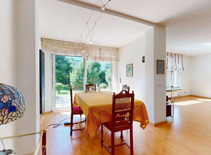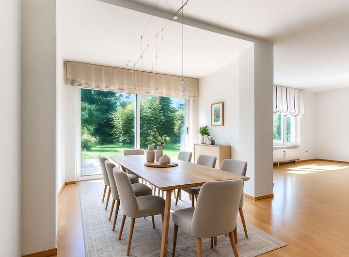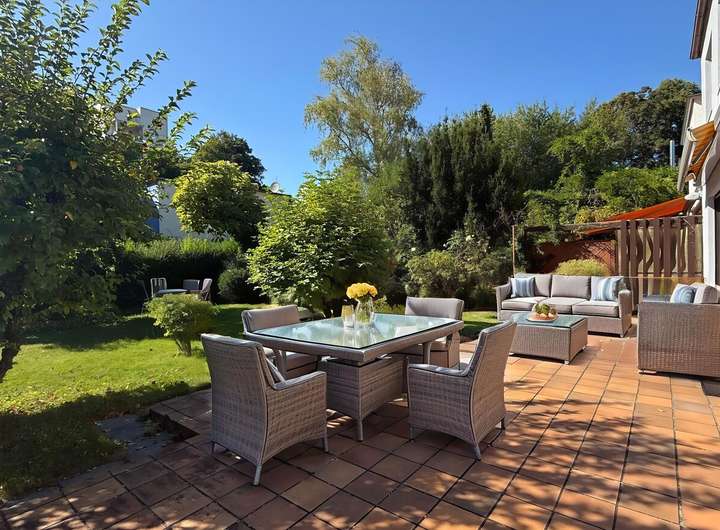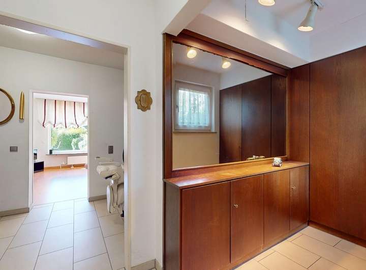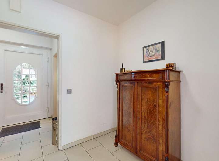 Der großzügige Eingangsbereich des Hauses ist mit einem geschmackvollen Garderoben- und Schuhschrank ausgestattet. Das offene und lichtdurchflutete Wohn- und Esszimmer wurde 1993 aufwendig vergrößert und überzeugt durch eine moderne Raumaufteilung. Der Bereich ist perfekt geeignet für gesellige Abende mit Familie und Freunden, da der Wohn-/Essbereich nahtlos zur großzügigen Terrasse führt. Zwei elektrische Markisen spenden angenehmen Schatten und erhöhen den Komfort des Außenbereichs.