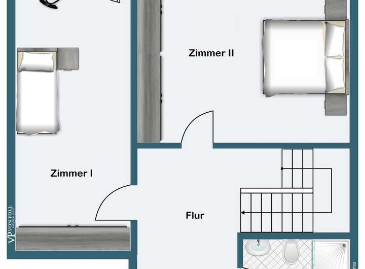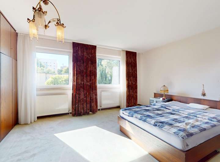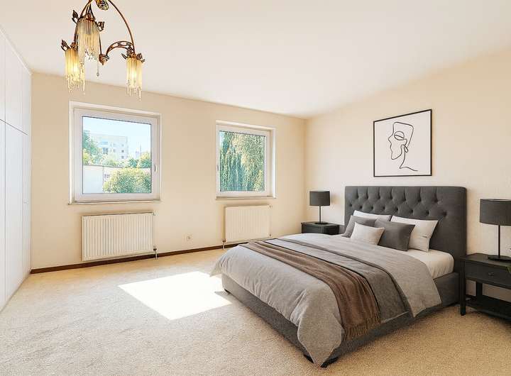 Im Obergeschoss befinden sich zwei gemütliche Schlafzimmer, die jeweils durch große Fenster lichtdurchflutet sind. Das Tageslichtbad ist mit einer Badewanne ausgestattet. Ein weiteres Highlight ist die Möglichkeit, eines der Schlafzimmer in zwei separate Zimmer umzuwandeln, wodurch die Immobilie noch flexibler genutzt werden kann.