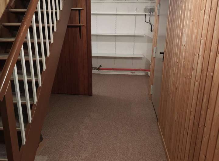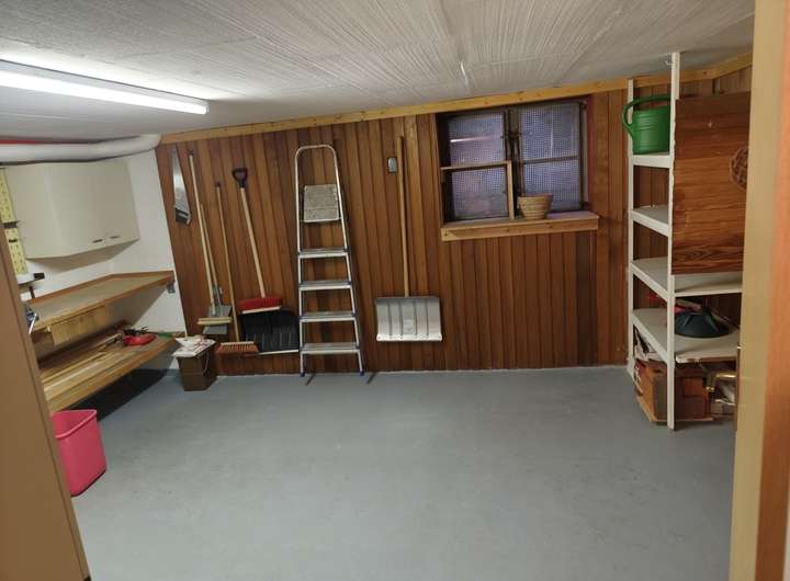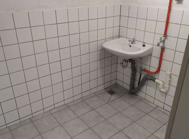 Waschmaschinenraum im Keller gefliest mit kleinem Waschbecken
