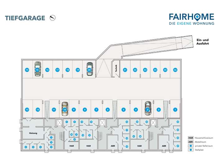 • Elektrofahrzeuge ganz bequem am Stellplatz in der Tiefgarage aufladen