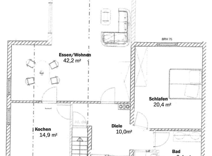 Ca. 100 m² Wohnfläche – 2,5 Zimmer – Diele - Küche – Bad – Gäste-WC; zzgl. Balkon, Dachboden; PKW-Stellplatz zzgl. 20 €/mtl.