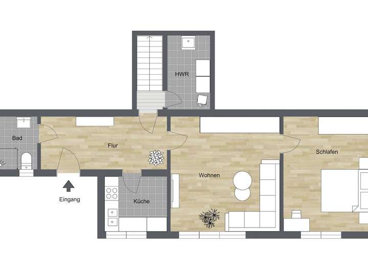 Moderne 2 Zimmer-Wohnung, Küche, Duschbad und Hauswirtschaftsraum ca. 53,00 m² Wohnfläche im Hanggeschoss.
