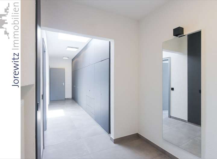 - Bodenbeläge: Kombination aus Laminat und großformatigen, modernen Fliesen