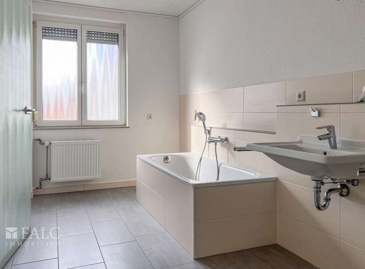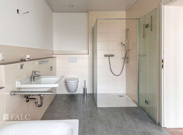 - Modernes Bad mit Dusche, Badewanne, Waschbecken und WC