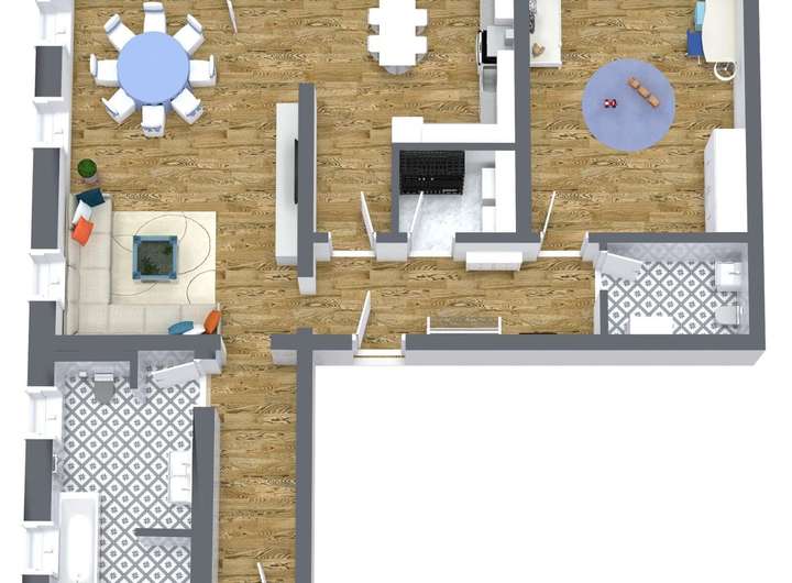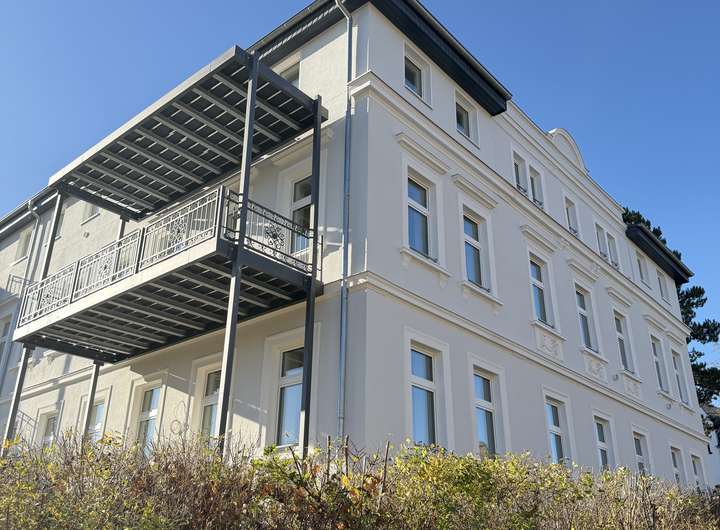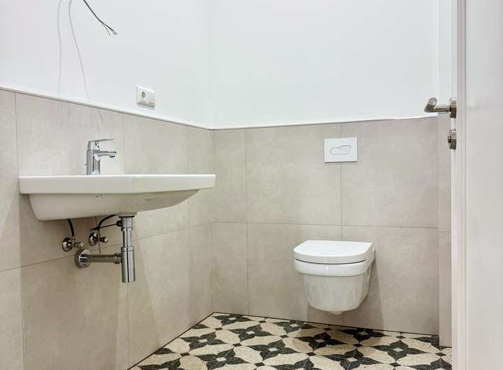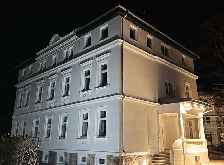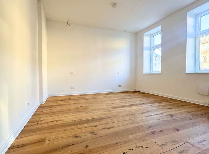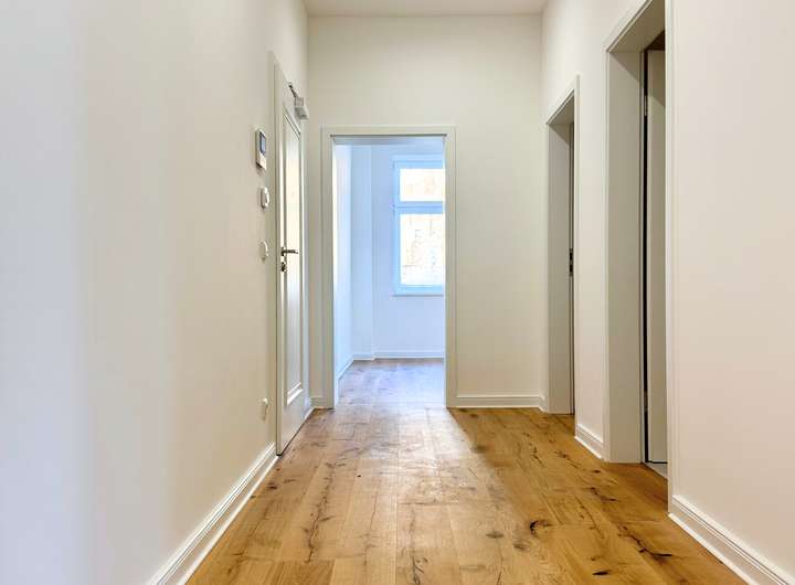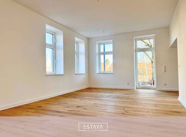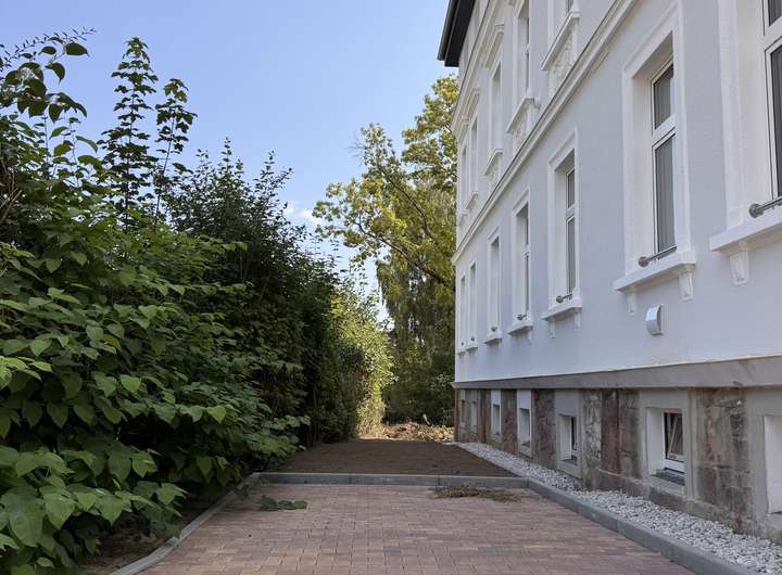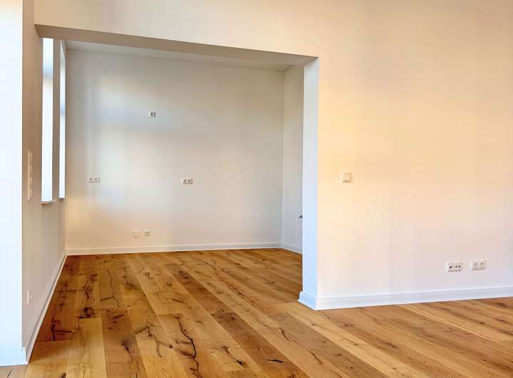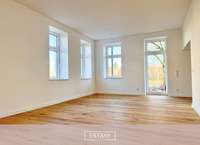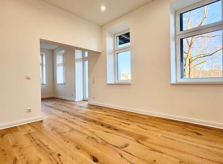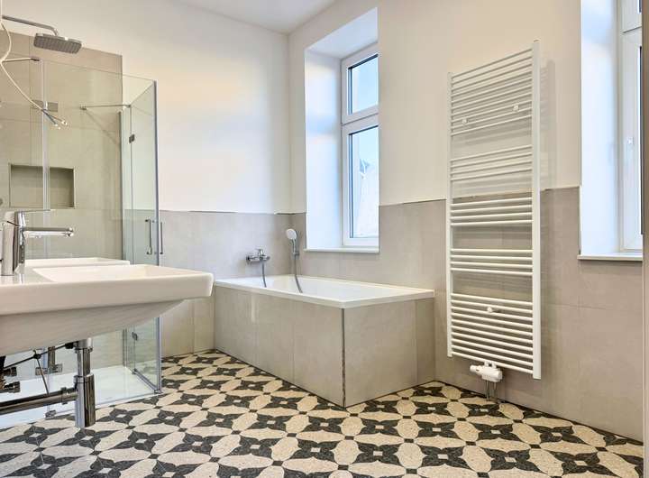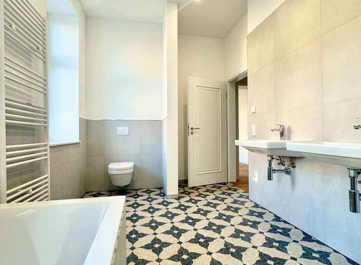 Durch die restaurierten Flügeltüren betreten Sie den großzügigen Flur der Villa, in dem eine wunderschöne 3,5-Raum-Wohnung entstanden ist. Hochwertige Materialien prägen den Innenraum und schaffen ein Gefühl der Geborgenheit. In den Fluren, Bädern und der Küche sorgen stilvolle Spots für angenehme Beleuchtung, während die Fußbodenheizung zusätzlichen Komfort bietet. Die offene Wohnküche lädt zum geselligen Beisammensein ein. Die Badezimmer sind mit eleganten Ornamentfliesen sowie Dusche und Badewanne ausgestattet. Der dritte Raum eignet sich ideal als Kinder- oder Arbeitszimmer, ergänzt durch ein praktisches Gäste-WC. Zusätzlich verfügt die Wohnung über einen Hauswirtschaftsraum und einen separaten Garderobenraum für mehr Stauraum. Ein besonderes Highlight der Wohnung ist der großzügige Garten mit etwa 120 m² sowie die Terrasse mit rund 30 m², die Sie bequem durch die Terrassentür im Wohnzimmer erreichen können. Die beiden Außenstellplätze sind nicht in der Warmmiete inklusive.