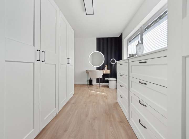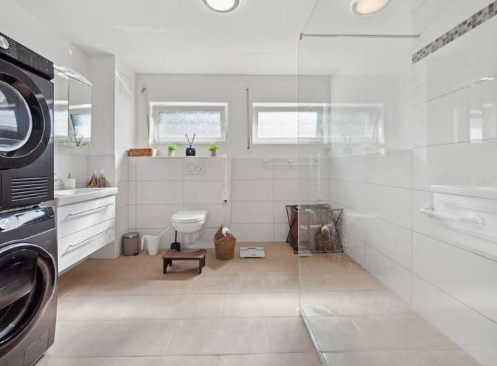 Im Erdgeschoss erwartet Sie ein zentraler Flur, von dem aus alle Räume bequem erreichbar sind. Das Herzstück dieser Etage ist das großzügige, helle Wohnzimmer mit offen gestalteter Küche – perfekt für gemeinsames Kochen und geselliges Beisammensein. Zwei gut geschnittene Schlafzimmer, ein Ankleidezimmer, ein modernes Tageslichtbad sowie ein separates Gäste-WC runden das Raumangebot im Erdgeschoss ab.