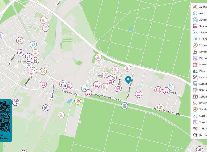 Die Nahversorgung in Bieber ist hervorragend. Für den täglichen Bedarf stehen ein Edeka und ein Rossmann in knapp einem Kilometer Entfernung zur Verfügung. Familien profitieren von der Nähe zu mehreren Spielplätzen und der Kita 14, die nur 193 Meter entfernt liegt. Die Schule Bieber Außenstelle Waldhof ist ebenfalls in fußläufiger Entfernung, was den Stadtteil besonders attraktiv für Familien mit Kindern macht.