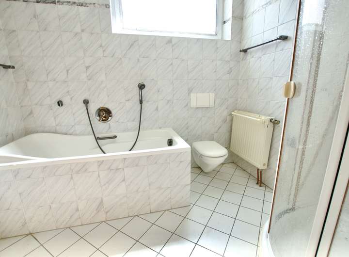 Sanitär: Wannen- und Duschbad aus den 90er Jahren und ein Gäste-WC.