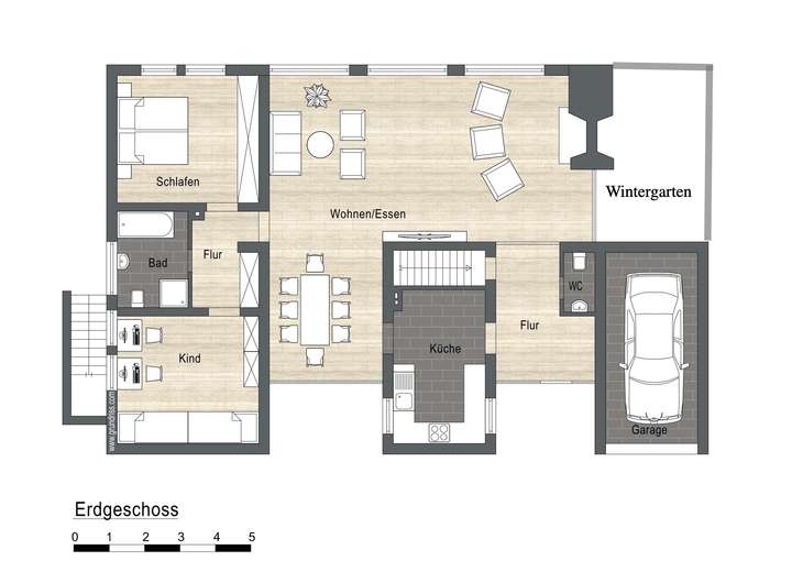 Garten: Wintergarten, Aussenterrasse , zwei Holz-Gartenhäuser.