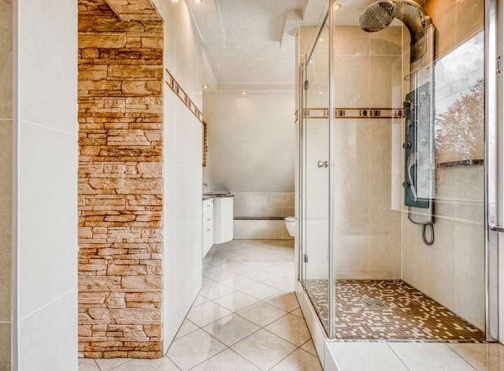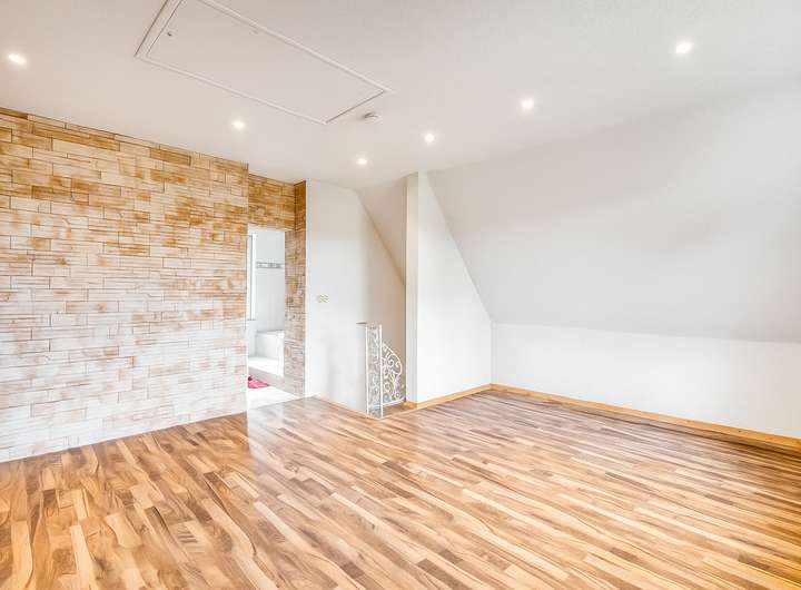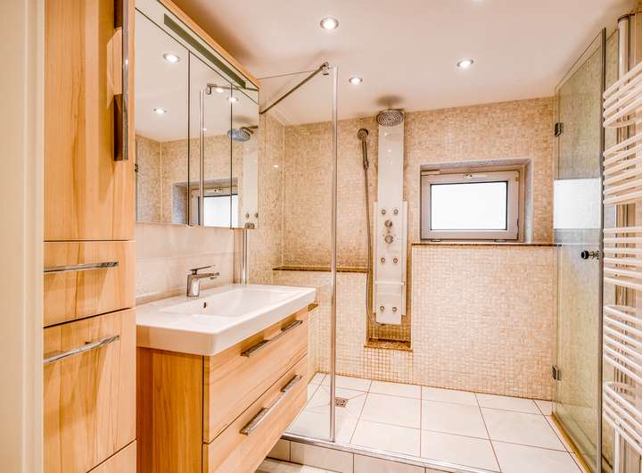 Das Obergeschoss beherbergt das großzügige Schlafzimmer unter dem Dach, das durch seine durchdachte Raumaufteilung und die maßgefertigte Schrankwand besonders viel Stauraum bietet. Das angrenzende Tageslichtbad im mediterranen Stil vermittelt mit warmen Farben und hochwertigen Fliesen echtes Urlaubsgefühl – eine kleine Wellnessoase im eigenen Zuhause.