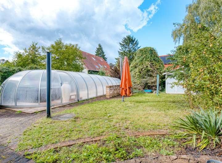 Der Außenbereich ist ein echtes Highlight: Der sonnige Garten bietet mit einem großen, beheizbaren Pool inklusive Gegenstromanlage und einem extragroßen Jacuzzi – beide überdachbar – beste Voraussetzungen für Erholung und Freizeitspaß. Eine mediterrane, überdachte Sitzecke aus dem Jahr 2016 schafft den idealen Platz für Grillabende und gemütliche Stunden im Freien. Dichte Hecken umrahmen das Grundstück und garantieren dabei maximale Privatsphäre.