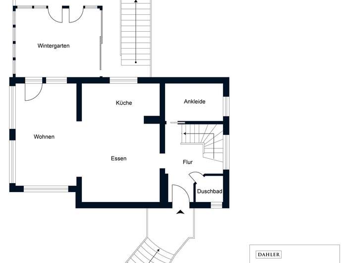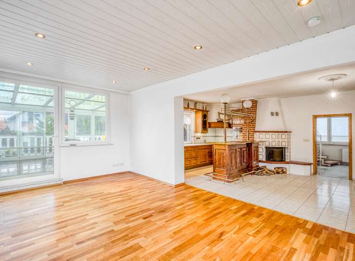 Das Herzstück des Hauses bildet der großzügige Wohn- und Essbereich mit beheiztem Wintergarten, der zu jeder Jahreszeit für eine warme und freundliche Atmosphäre sorgt. Großflächige Fenster lassen viel Licht herein und öffnen den Blick ins Grüne. Der angrenzende Essbereich mit Kamin schafft zusammen mit der stilvollen Einbauküche einen Ort, an dem sich Alltag und Genuss perfekt verbinden – ideal für gesellige Abende und entspannte Stunden mit Familie und Freunden. Auf derselben Ebene befinden sich außerdem ein modernes Duschbad sowie ein praktischer Ankleideraum mit maßgefertigten Einbauschränken.