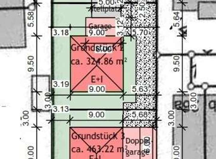 Aktuell handelt es sich um ein größeres Grundstück, welches in drei Parzellen mit 311 m², 324 m² und 463 m² aufgeteilt wird.