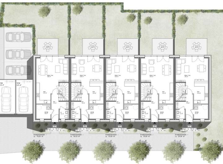 Flur, Gäste- WC, Hauswirtschaftsraum sowie Badezimmer werden gefliest. Die Wohnräume werden mit Kunststoff-Vinylböden ausgestattet. Die Kunststoff- ISO- Fenster ( Dreischeiben ) werden mit teilw. elektrisch bedienbaren Rollläden ausgestattet. Beheizt werden die Reihenhäuser mit Hilfe einer Luft-/ Wasserwärmepumpe. In allen Zimmern wird eine Fußbodenheizung verlegt. Das großzügige Badezimmer ist mit Badewanne, Dusche sowie Waschbecken und WC ausgestattet.
