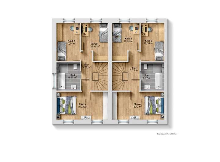 Obergeschoss: Flur, Elternzimmer, Badezimmer, Kinderzimmer I und Kinderzimmer II