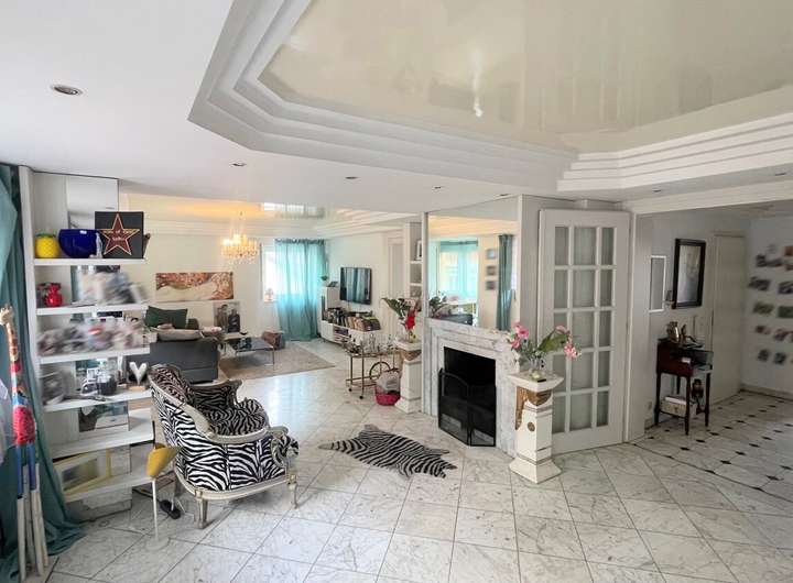 Sie verfügt über ein großes Wohn-/ Esszimmer mit drei Erkern und einem Kamin, einer Einbauküche mit Elektrogeräten sowie drei Bädern (eines davon en Suite an das Schlafzimmer grenzend, unter anderem auch mit einer Badewanne).