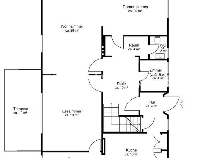 - Zahlreiche originale Stilelemente der Bauzeit, wie Holzdielenböden und kassettierte Türen