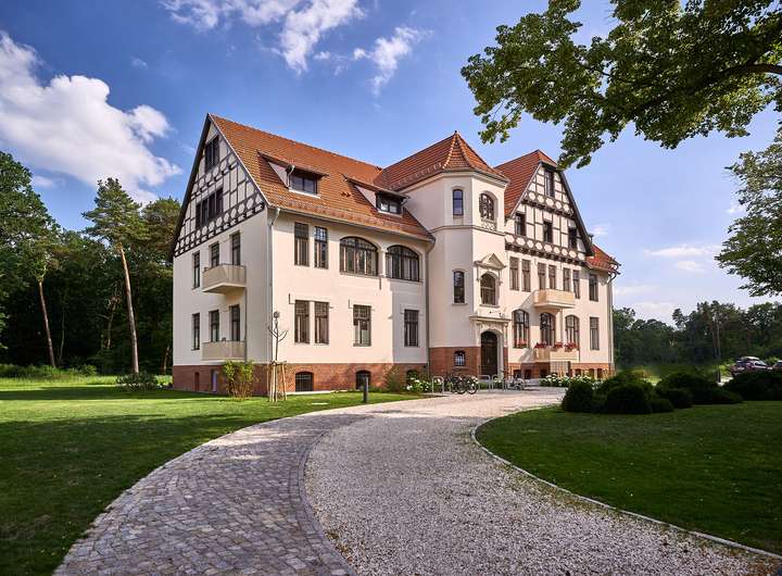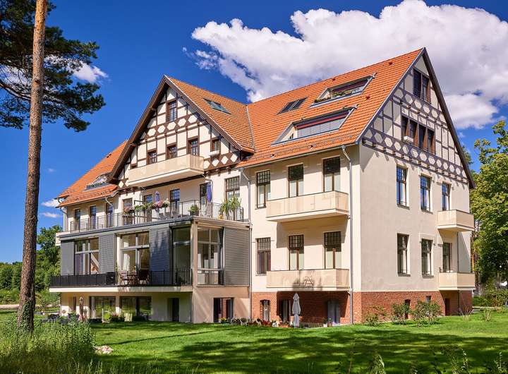 Das Wohnen in der Villa Sachs bietet erlesenen Wohnkomfort in einem historischen Gebäude. Die Villa liegt nur 150 Meter vom Lehnitzsee entfernt und ist von einem waldähnlichen Park umgeben. Sie ist eine denkmalgeschützte Immobilie und wurde mit viel Liebe zum Detail saniert.