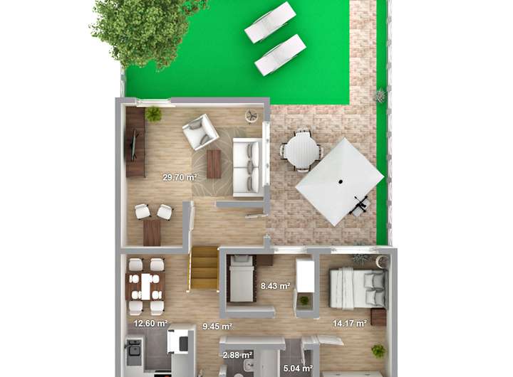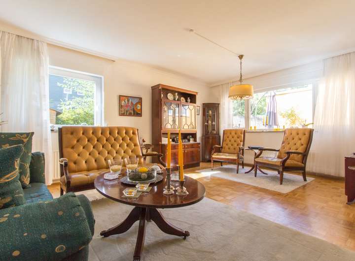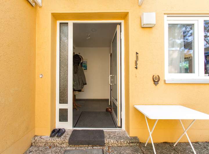Zum Objekt gehört eine eigene Garten- und Hoffläche am Eingangsbereich, die durch die Teilpflasterung auch pflegeleicht nutzbar ist. Vom Eingangsflur erreichen Sie auf der rechten Seite das ca. 30 m² große Wohnzimmer mit Blick ins Grüne.