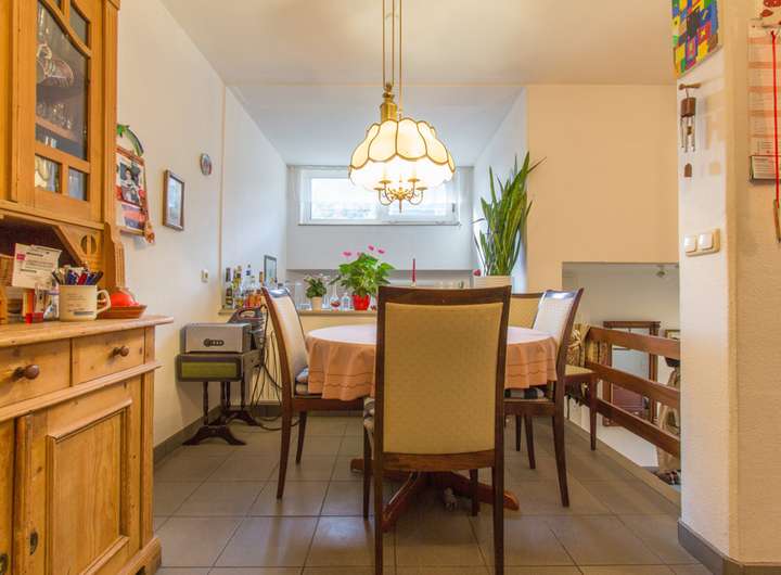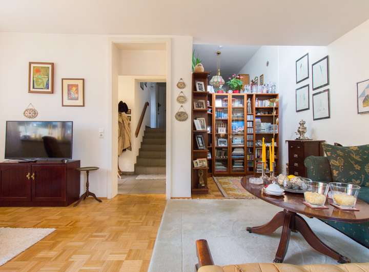 Der Wohnbereich ist mit hochwertigem Stäbchenparkett ausgestattet. Über sieben Stufen gelangt man auf die obere Ebene, wo die offene Küche mit Essbereich sowie die beiden Schlafzimmer angeordnet sind.