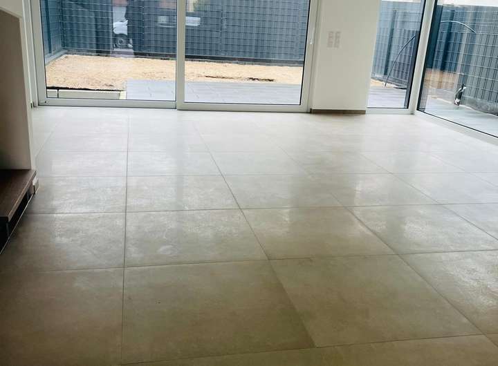 Bereits beim Betreten spürt man die Helligkeit und Großzügigkeit der Räume – großformatige Fliesen unterstreichen das stilvolle Wohnambiente. Der offene Wohn- und Essbereich mit direktem Zugang zur Terrasse schafft fließende Übergänge zwischen Innen- und Außenraum.