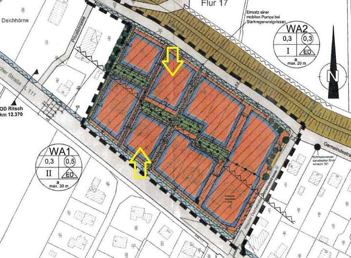Die Erschließung (Zufahrt) muss entweder über das vordere Grundstück oder über die Ritscher Deichstraße erfolgen. Wobei die Ritscher Deichstraße zum jetzigen Zeitpunkt nicht mit einem PKW befahrbar ist.