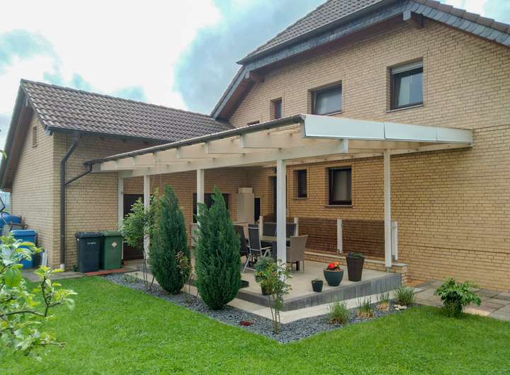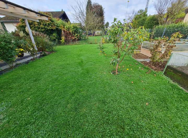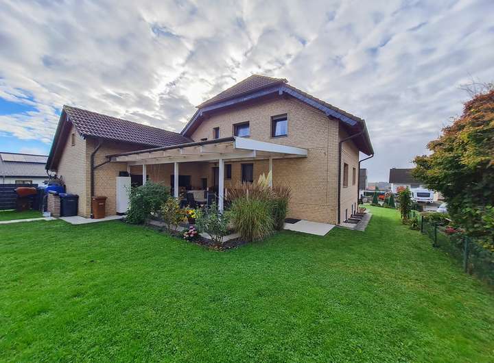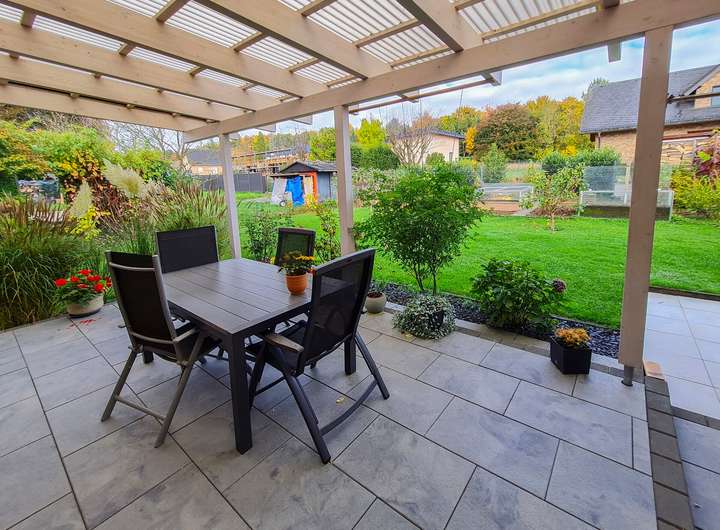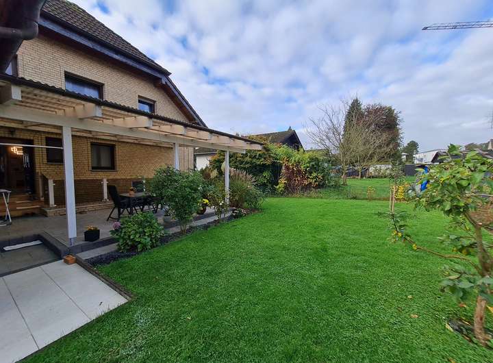 Das Grundstück von ca. 695 m² ist eingezäunt und pflegeleicht angelegt. Im hinteren Gartenbereich befindet sich ein Gartenhaus und dort ist auch ein Nutzgarten, teils auch mit Sträuchern angelegt. Zudem lädt eine große, überdachte Terrasse zum gemütlichen Verweilen ein.
