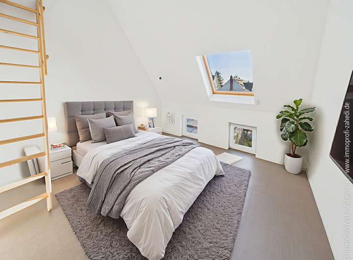 Im Dachgeschoss fühlen sich Kinder sofort zu Hause: Zwei gemütliche Zimmer mit jeweils eigener Schlafgalerie schenken jedem Kind eine kleine persönliche Welt zum Spielen, Lernen und Träumen. Ein Abstellraum und ein weiterer Raum mit Heiztechnik, der sich perspektivisch zu einem Duschbad ausbauen lässt, erweitern die Nutzungsmöglichkeiten.