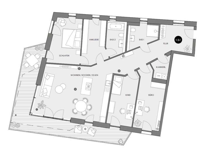 * Die Wohnung besticht durch eine harmonische Auswahl an hochwertigen Materialien: sorgfältig aufeinander abgestimmte Holzarten, elegante Fliesen sowie ein modernes Bad und Armaturen sorgen für ein stimmiges und stilvolles Wohnambiente.