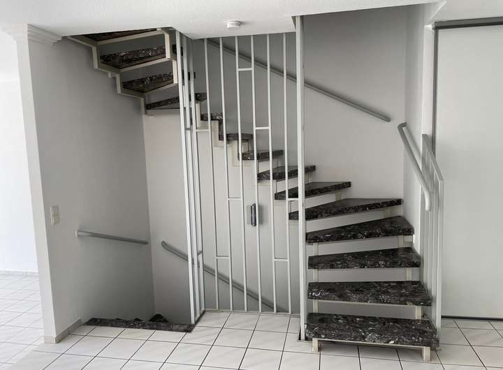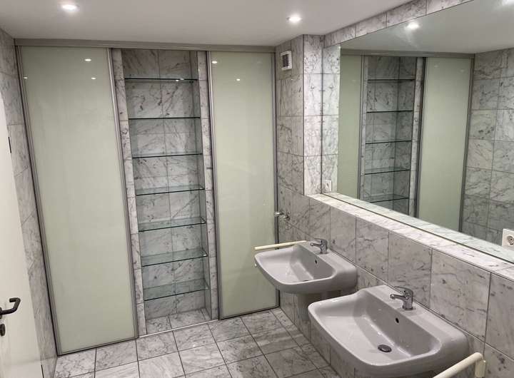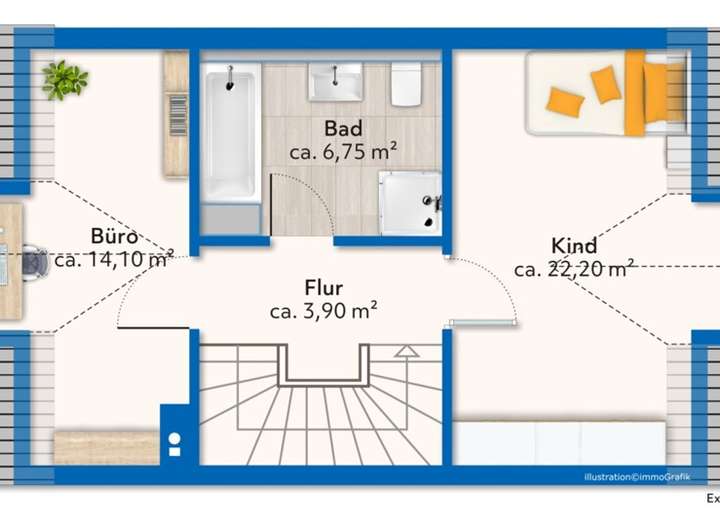 Das Obergeschoss beherbergt zwei Zimmer, die flexibel als Büro oder Kinderzimmer genutzt werden können. Eines der Zimmer bietet einen eigenen Balkon mit Blick in den Garten. Das luxuriöse Masterbad ist mit hochwertigem Marmor ausgestattet und verfügt über eine Dusche, Doppelwaschbecken, WC und einen Einbauschrank.