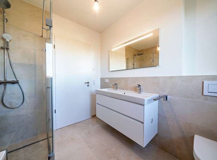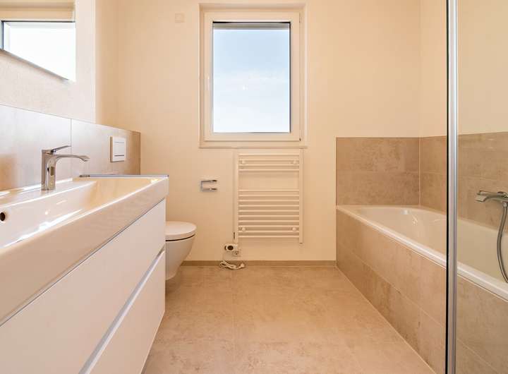 Die hochwertige, große Küche ist ein echtes Highlight der Wohnung: Ausgestattet mit erstklassigen Markenprodukten und einer Kochinsel, bietet sie viel Platz für kreative Kochideen. Dass moderne Badezimmer ist mit einer bodentiefen Dusche, einer Badewanne und einem Doppelwaschbecken ausgestattet und verbinden Design mit Funktionalität.