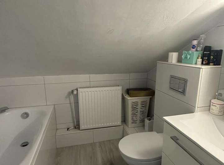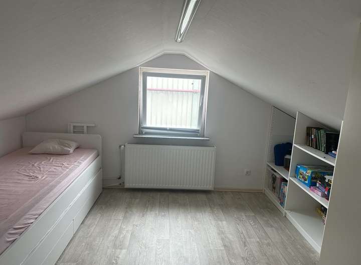 Das Dachgeschoss wurde zusätzlich ausgebaut und bietet zwei weitere Räume – ideal als Kinder-, Gäste-, Arbeits- oder Hobbyzimmer – sowie ein kompaktes Bad mit kleiner Badewanne.
