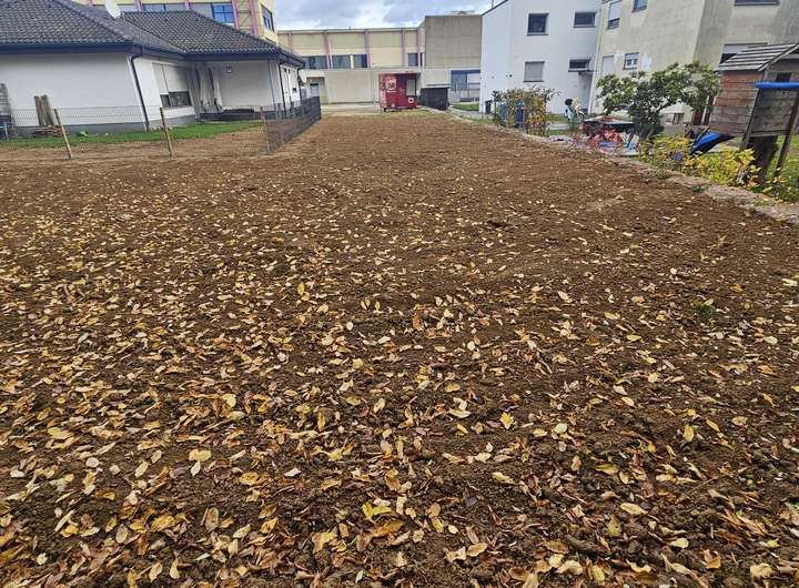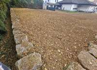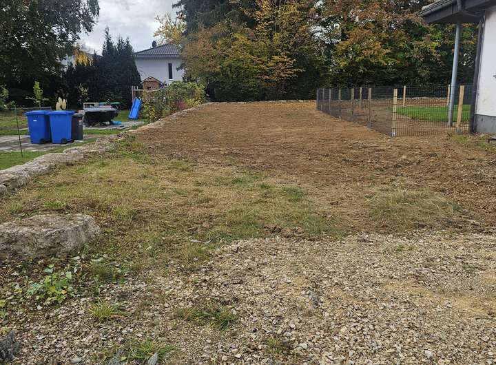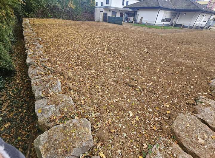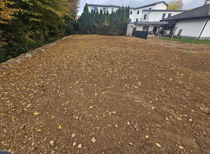 Ein ca. 4 m breiter Streifen führt links am bestehenden Haus vorbei zum rückwärtigen südwestlich ausgerichtem Bauplatz. Dieser ist bereits eben planiert und mit Natursteinen abgegrenzt.
