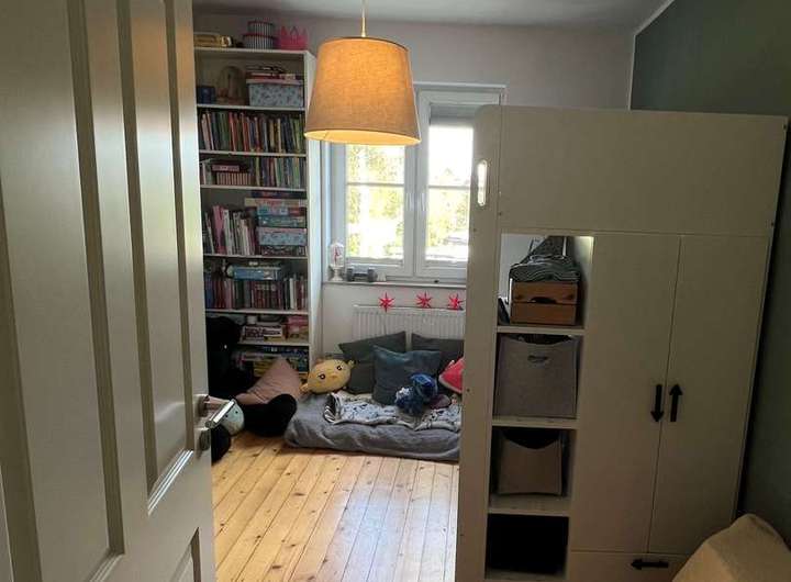 In das neu und aufwendig gestaltete Dachgeschoss führt eine Holztreppe in Buche, oben erwarten einen drei, mit viel Detailliebe gestaltete Kinderzimmer und ein Duschbad.
