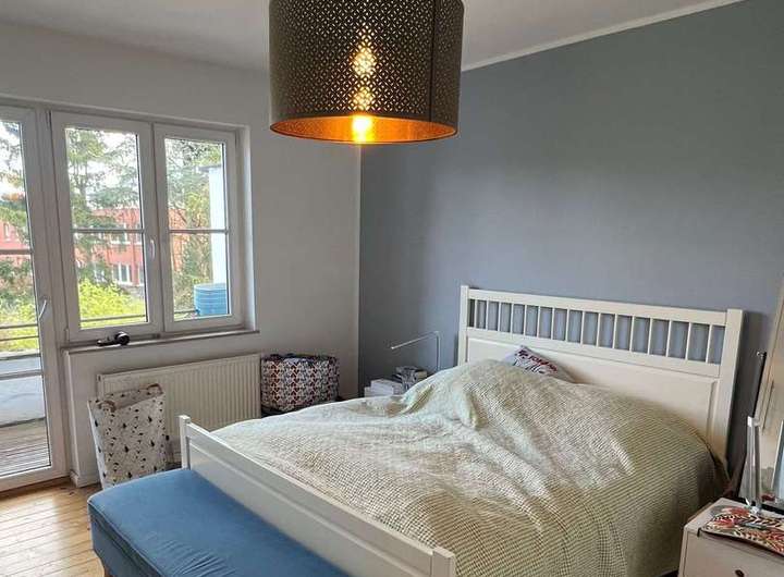 Im 1. Obergeschoss befindet sich ein Kinderzimmer. Nebenan ist das Elternschlafzimmer mit Zugang auf den ca. 4m² großen Balkon, von dem man direkten Gartenblick hat. Nebenan befindet sich ein Arbeits-/Gästezimmer und ein Badezimmer mit Dusche und Badewanne.