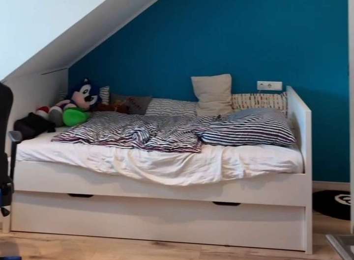 Die Kinderzimmer im Dachgeschoss sind mit Vinylböden in grauer Holzoptik ausgelegt, was zu den modernen weißen Einbauschränken in den Jugendzimmern hervorragend passt. Das Duschbad im Dachgeschoss ist weiß gefliest mit blau/grau gemusterten Bodenfliesen.