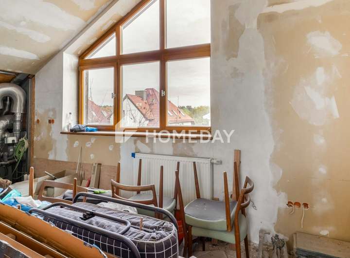 Ein weiterer Wohnbereich im Dachgeschoss verfügt über rund 65 Quadratmeter Wohnfläche mit zwei Zimmern und einer großen Dachterrasse, die einen wunderbaren Blick in die grüne Umgebung bietet. Die Küche in dieser Etage ist vorbereitet und kann nach individuellen Vorstellungen fertiggestellt werden. Beide Wohneinheiten sind durchdacht geschnitten und bieten viel Raum für unterschiedliche Wohnkonzepte.