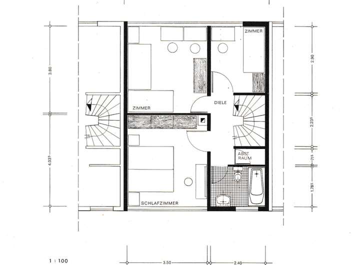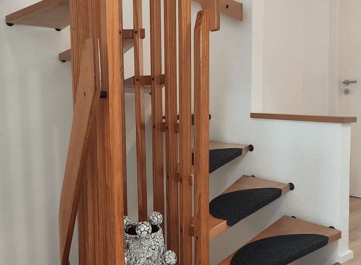 Über die elegant geschwungene Holztreppe gelangen Sie in das Obergeschoss mit seinen drei gut geschnittenen, ebenfalls mit breiten Fensterfronten versehenen Zimmern, die sich als Schlaf-, Kinder, Gäste- und Arbeitszimmer nutzen lassen. Das moderne Tageslichtbad verfügt über eine Badewanne mit Duschwand und Regendusche, Waschbecken, WC und ein großes Fenster, das für viel Licht und gute Lüftungsmöglichkeit sorgt. Eine Besenkammer liefert in dieser Etage zusätzlichen Stauraum.