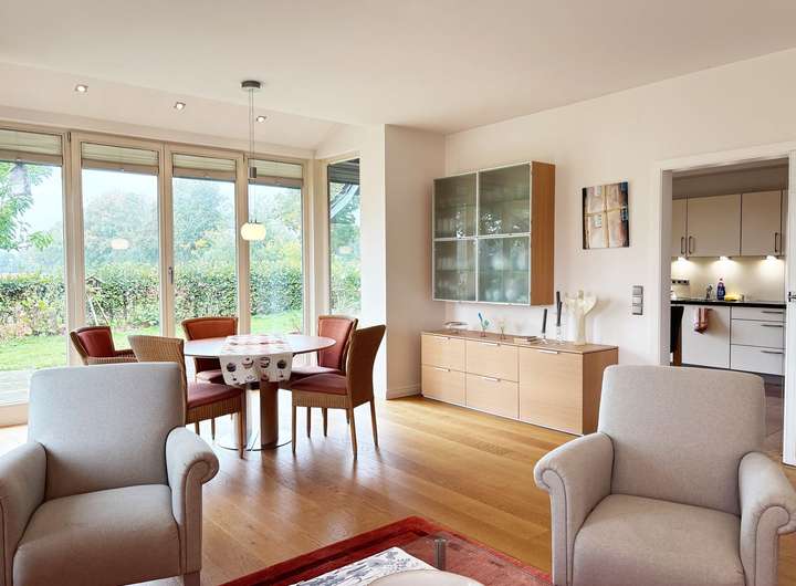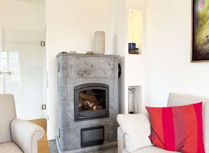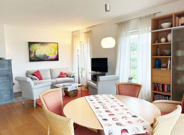 Der Kaminofen sorgt für gemütliche Stunden, während bodentiefe Fenster und mehrere Fenstertüren Richtung Garten und Terrasse für Licht und Weite sorgen.