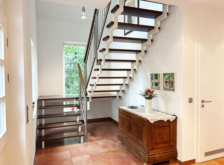 Eine offene Treppenanlage mit schwebenden Stufen und Edelstahlgeländer setzt architektonische Akzente.