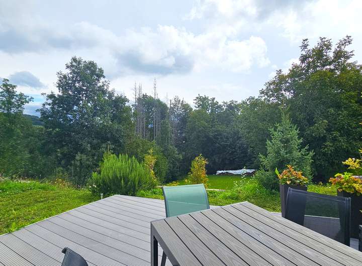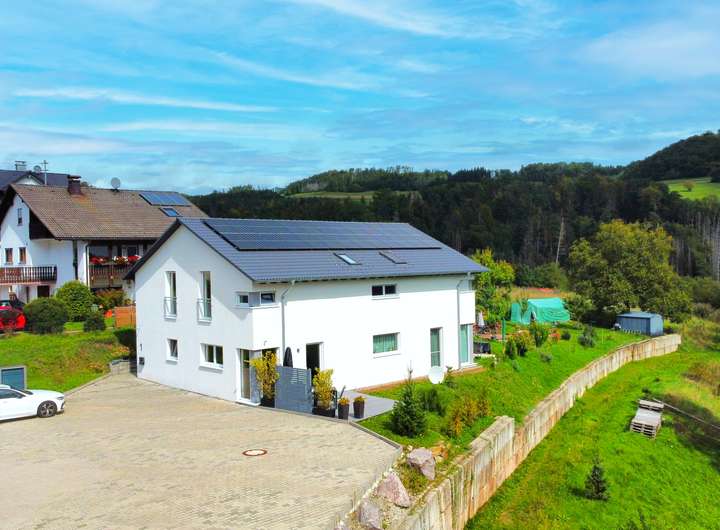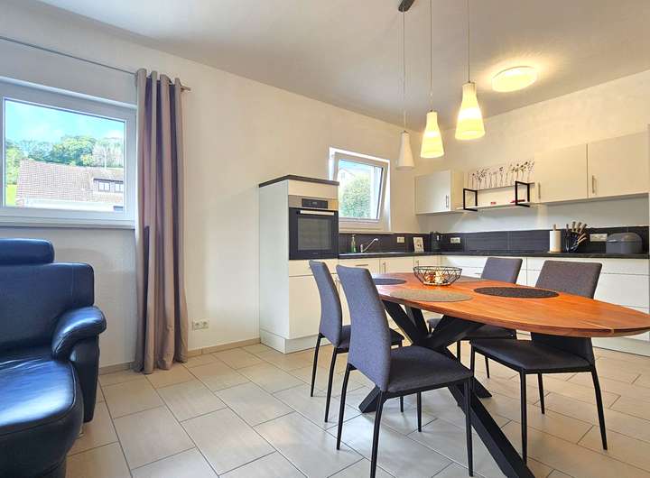 Schon beim Betreten der Immobilie empfängt Sie ein kleiner Flur mit offenem Treppenhaus, der alle Räume im Erdgeschoss miteinander verbindet. Am Ende der Diele befindet sich die großzügige Wohnküche mit moderner Ausstattung. Der Wohnbereich ist offen und hell gestaltet und sorgt dank großer Fensterflächen für ein angenehmes Wohngefühl. Ein besonderes Highlight ist der direkte Zugang zur Terrasse, die zum Verweilen und Genießen einlädt und einen wunderbaren Blick über die im Tal liegenden Wälder gewährt. Zusätzlich befindet sich auf dieser Ebene ein modernes Gäste-WC, welches die privaten Flächen angenehm vor Gästen bewahrt und zusätzlich sanitäre Anlagen auf dieser Ebene bietet.