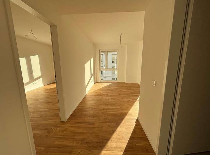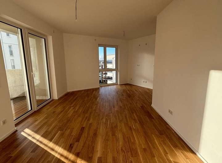 Die Wohnung befindet sich im Erstbezug und bietet helle, freundliche Räume. Wohn- und Schlafzimmer sind mit hochwertigem, pflegeleichtem Parkett ausgestattet. In Küche und Bad sorgen moderne Fliesen für eine stilvolle und funktionale Optik. Das Badezimmer verfügt über hochwertige Sanitärobjekte und zeitgemäße, wassersparende Armaturen.