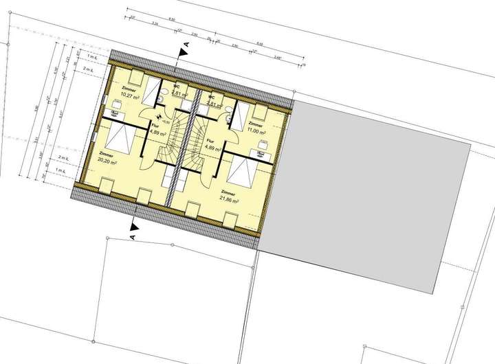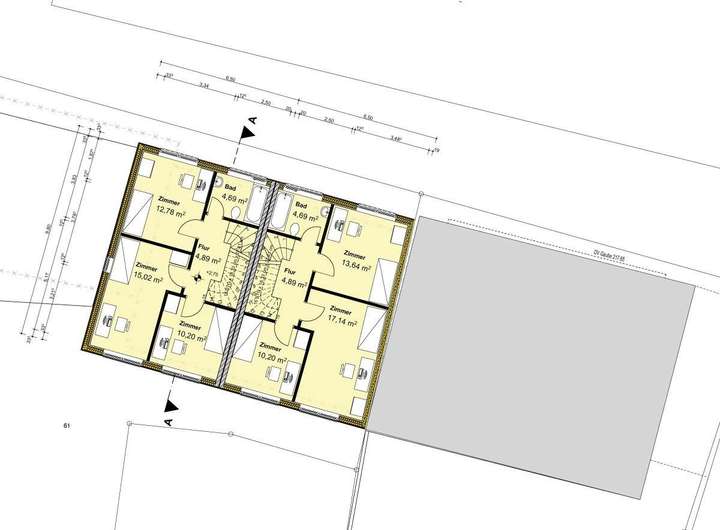 Zum Angebot gehört eine bestehende Baugenehmigung für zwei moderne Wohneinheiten: ein Reihenmittelhaus sowie ein Reihenendhaus mit einer geplanten Gesamtwohnfläche von 282,95 m². Ergänzt wird das Ensemble durch eine großzügige Doppelgarage, die den Wohnkomfort abrundet.