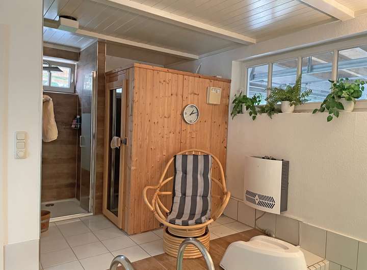 Eine Sauna für 2-3 Personen, eine Dusche mit niedrigem Einstieg und der Zugang zum Gäste-WC von hier aus machen die Wellness-Oase komplett.