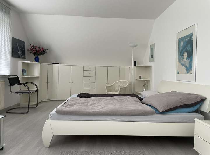 Stellfläche für Regale und Schränke findet sich an der Ostwand. Zusätzlichen Stauraum bieten zwei begehbare Schränke an der Nordwand und an der Südwand des Raumes.