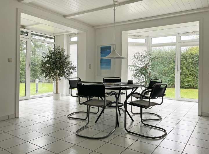 Der Essbereich liegt im südwestlichen Teil des Raumes. Hier wurde ein großer, runder Esstisch mit Stühlen mittig im Raum aufgestellt. Von hier aus blickt man durch die bodentiefen Fenster der Glaserker nach Süden und Westen direkt in den Garten.