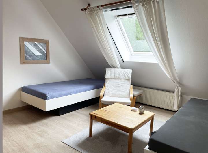 Im kleinsten Raum des Obergeschosses wurde ein Gästezimmer eingerichtet. Man kann ihn sich aber auch als Hobbyraum, Home-Office oder Zimmer für ein Kleinkind vorstellen.