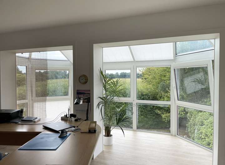 Der Umbau des Balkons macht das nach Westen gelegene Arbeitszimmer mit gut 30 m² zum größten Raum des Obergeschosses. Er verläuft über die gesamte Hausbreite und bietet einen imposanten Blick ins Grüne. Einen schöneren Arbeitsplatz kann man sich kaum vorstellen!
