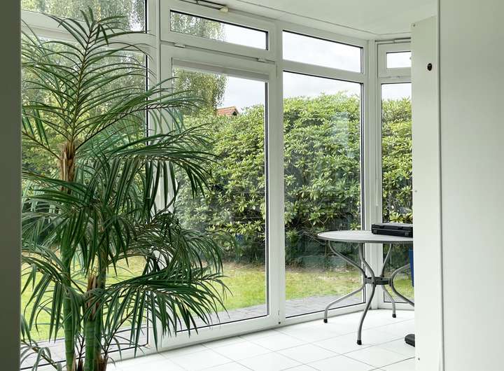 Auf der rechten Seite führen die vordere Zimmertür in die Küche und das Vollglas-Element in den Wohn-Ess-Raum.